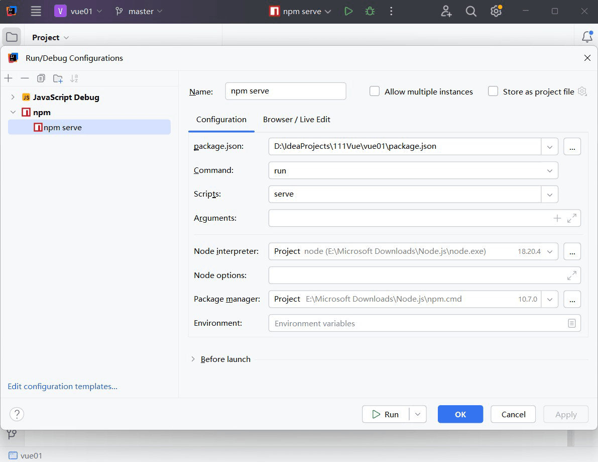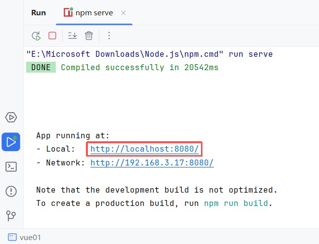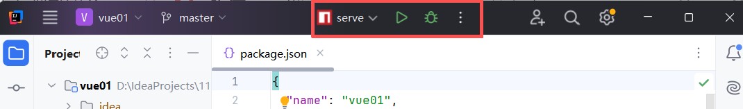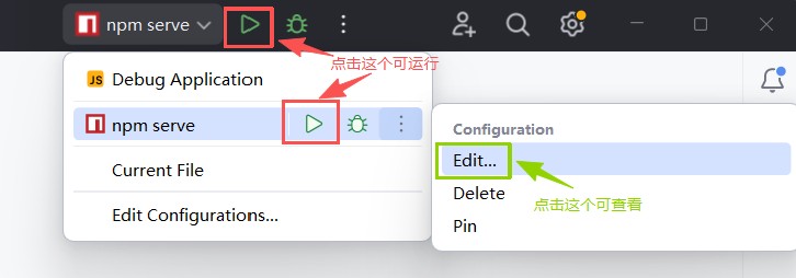 使用脚手架搭建的项目已经具备基本条件,选择 npm serve 后直接点击绿色运行按钮即可。
