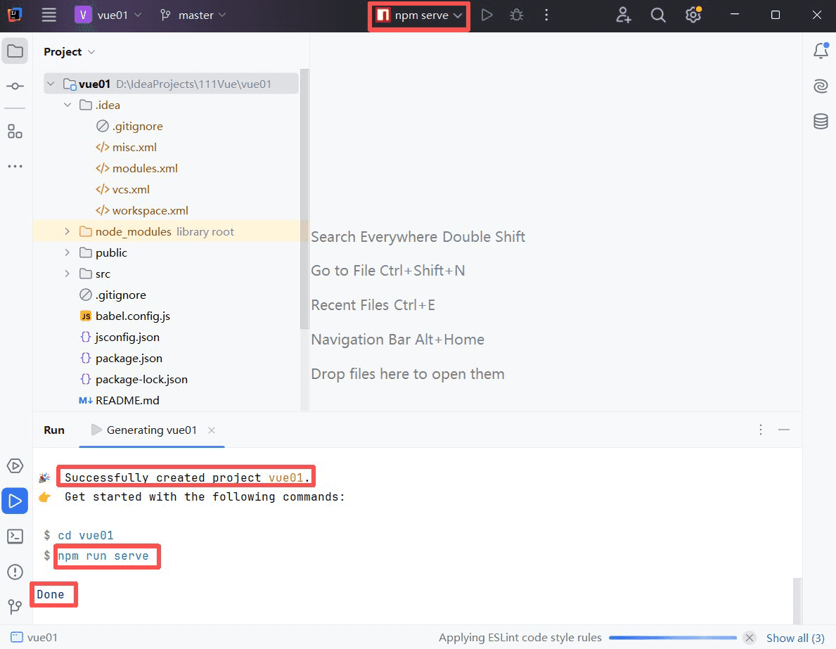 如果不是第一次创建项目会自动使用 Vue 脚手架初始化整个项目。非常明显的在 Run 面板自动在下载安装内容。当下载安装完成后会出现。内容中说明: Successfully:已经成功创建项目