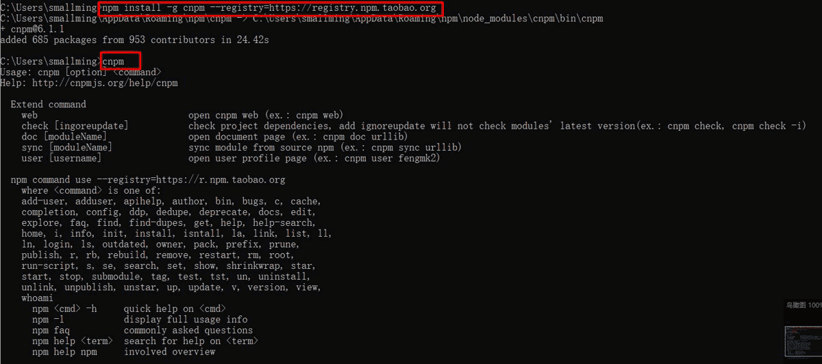 运行完成后通过 cnpm 命令查看是否安装成功,成功会提示下面信息。如果没有成功会提示没有 cnpm 命令,然后在进行安装一次即可。