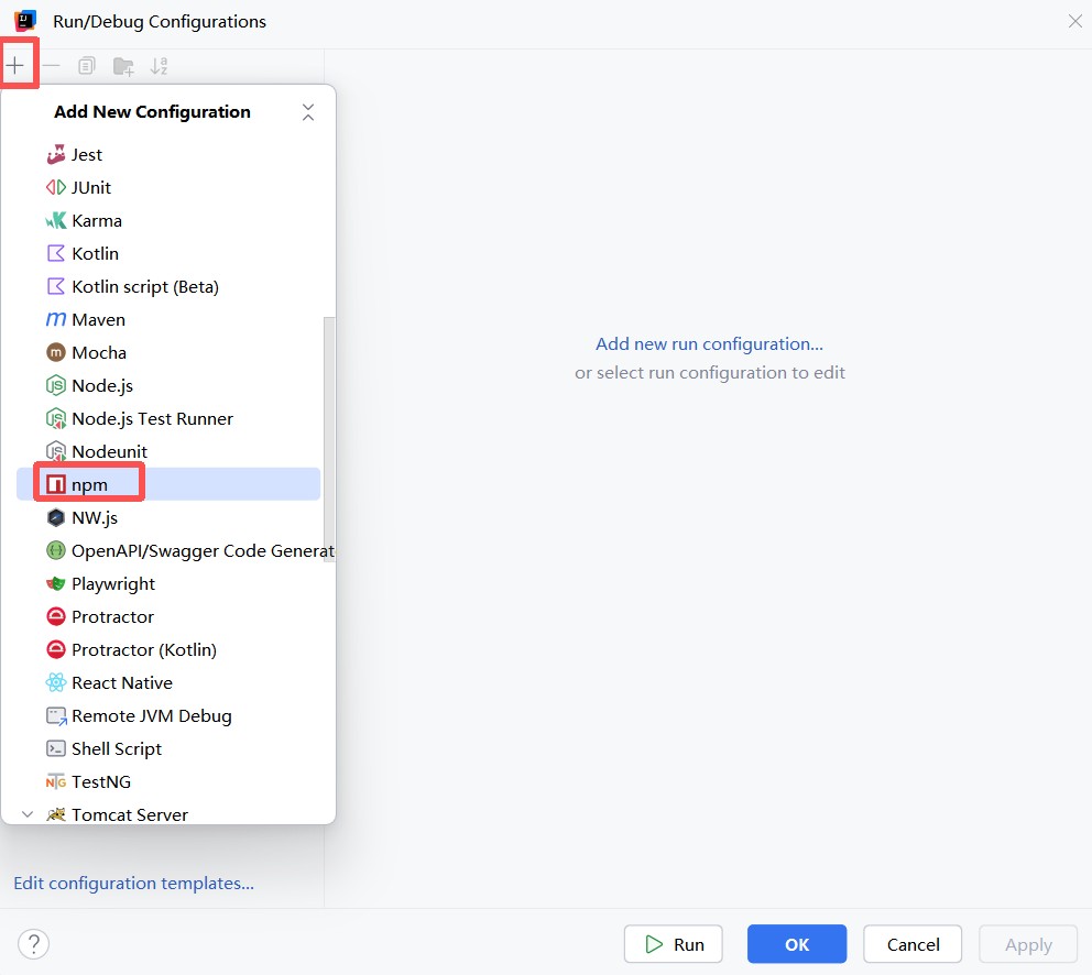 2. 点击左上角的 +号,在列表里找到并点击npm