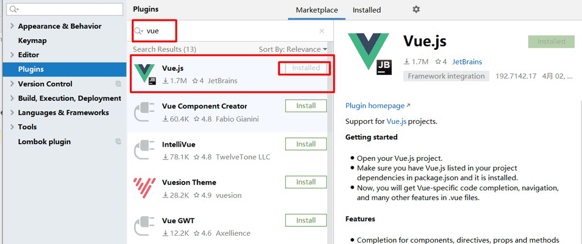 在IDEA中:菜单 settings -> plugins -> 搜索 vue -> Vue.js 点击 install -> 安装后重启 idea