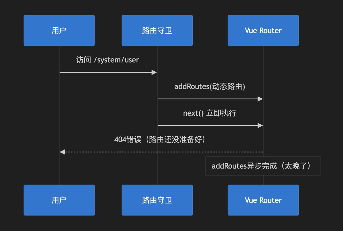 // 问题代码 router.addRoutes(dynamicRoutes) // 动态添加路由 next() // 立即跳转,但路由可能还没添加完成!