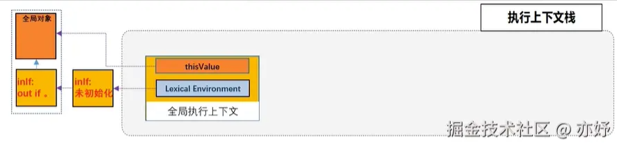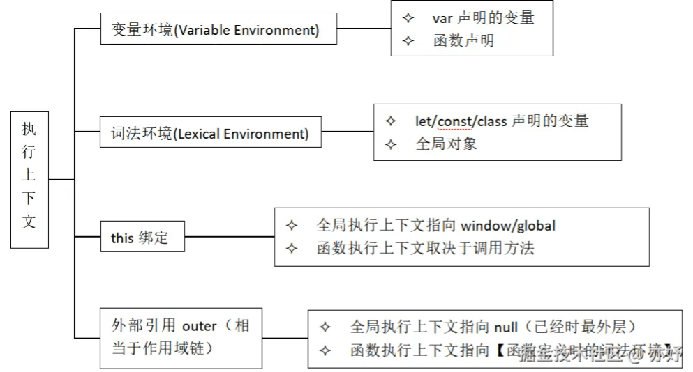 let/const/class声明的变量和全局对象; this绑定对于全局执行上下文,如果是浏览器绑定的是window,如果是node.js指向的就是global,函数执行上下文中的this指向取决于函数的调用方法;- 外部引用其实就是作用域链,全局执行上下文引用为