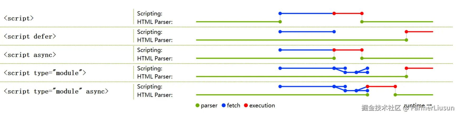 <script type="module"> | DOM解析后 | 否 | 文档顺序 | ES模块化代码 |