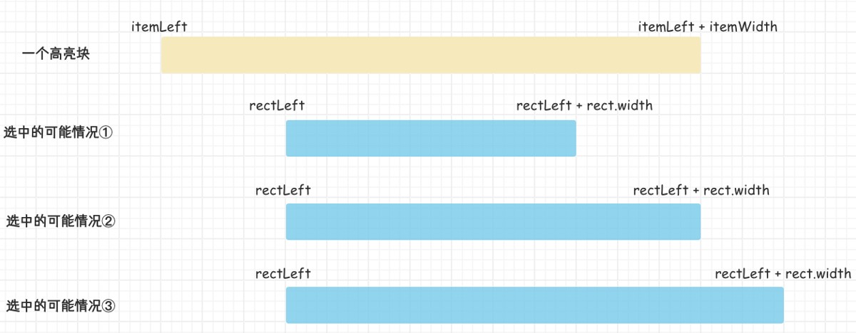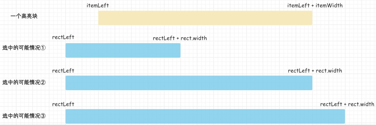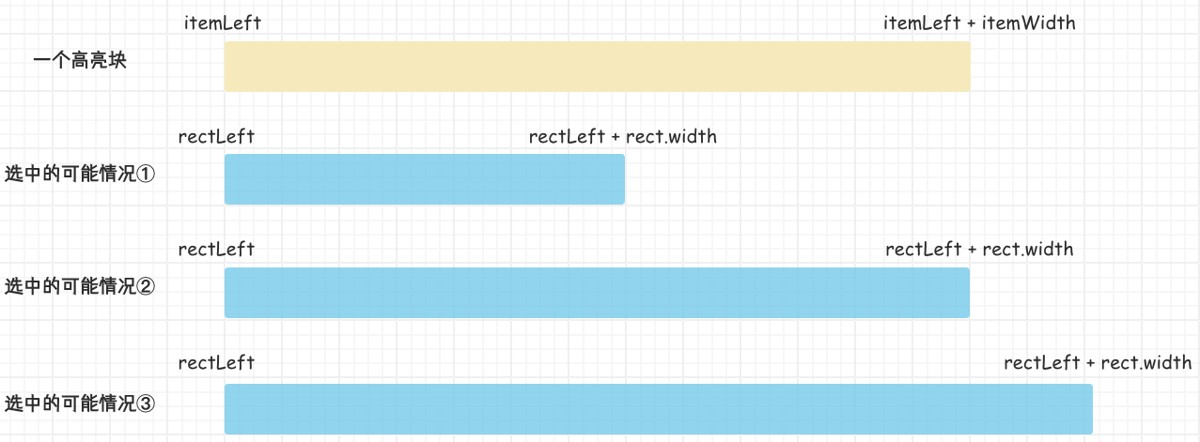 确保选中范围与高亮块有交集,那么选中范围相对于高亮块的位置有可能三种情况【左相交,包含,右相交】