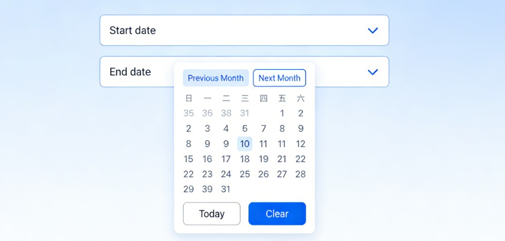 time.getTime() > today.getTime()→ 禁止选择今天以后的日期- 联动开始时间 → 禁止选择早于开始时间的日期