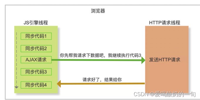 网络请求线程处理,JavaScript引擎此时不需要等待其执行完毕,就可以接着执行console.log(“123”) - 如果请求接口返回了数据,这个时候,JavaScript会将消息添加到消息队列,如果此时队列没有其他消息,便可以立即处理这个消息,然后调用其关联的回调函数:function (response) {console.log(response);}