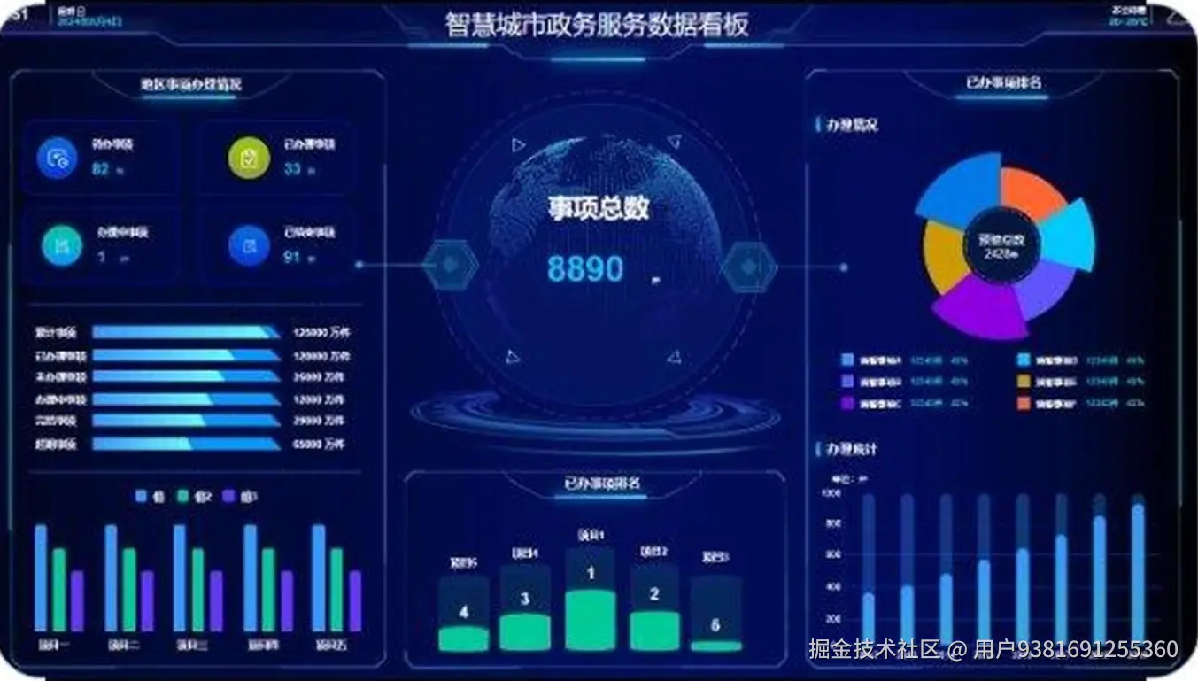 数据大屏页面布局很清晰,能很清楚的看出分了几个区域。现在以下面的大屏图为示例,说一下如何布局。