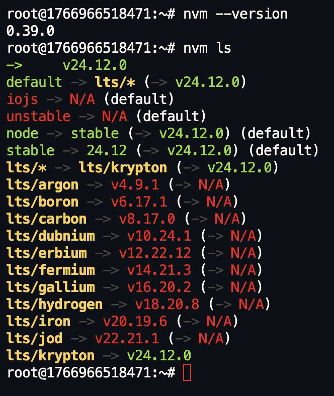 # 重新加载 bash 配置 source ~/.bashrc # 验证安装 nvm --version # 查看可安装的 Node.js 版本 nvm ls-remote # 安装最新的 LTS 版本(推荐) 这里是 v24.12.0 nvm install --lts # 查看 nvm ls