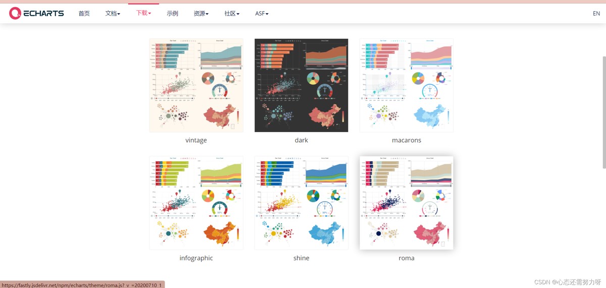 这个时候我们的可视化,基本完成了,但是,我们可以看到我的的样式有一些普通,这个时候我们官方网站中去下载主题js文件,下面给出网址以及如何操作