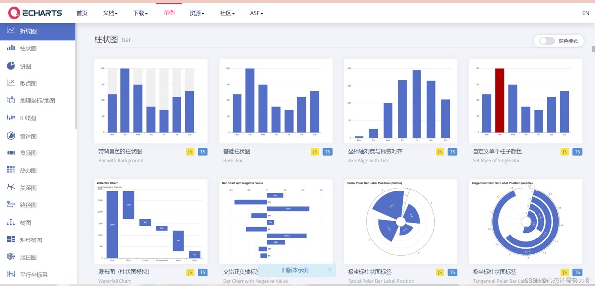 const mycart = this.$echarts.init(userdom)绘制需要的图表需要到官方去寻找我们需要的图表,这里给出官网的链接