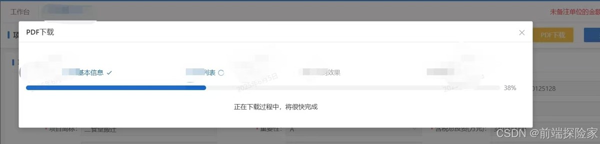 项目需求案例背景,点击【pdf下载】按钮,弹出pdf下载弹窗,显示需要下载四个模块的下载进度,下载完成后,关闭弹窗即可!