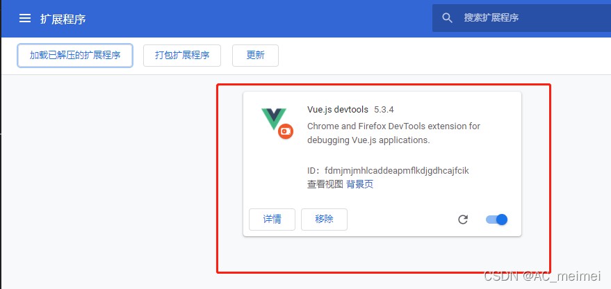 打开扩展程序(右上角4个点—>更多工具—>扩展程序—>打开开发者模式开关)。