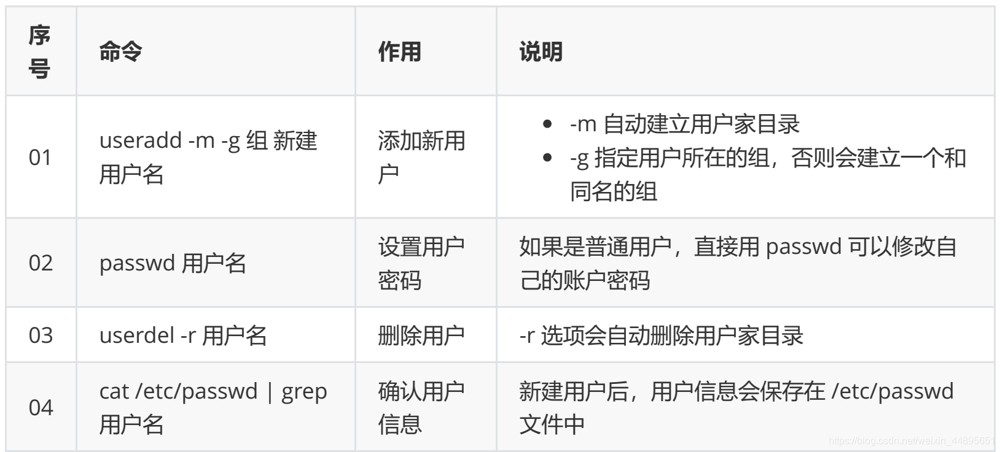 | 01 | su - 用户名 | 切换用户,并且切换目录 | - 可以切换到用户家目录,否则保持位置不变 |