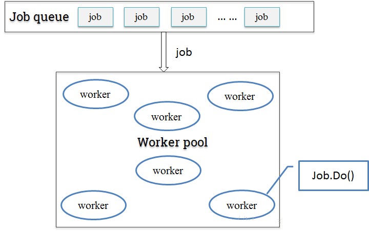 只用缓冲队列不能解决根本问题,这时候我们可以参考一下线程池的概念,定一个工作池(协程池),来限定最大goroutine数目。每次来新的job时,从工作池里取出一个可用的worker来执行job。这样一来即保障了goroutine的可控性,也尽可能大的提高了并发处理能力。