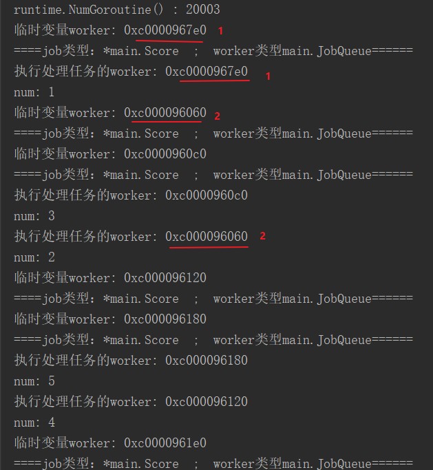 }分别输出临时变量worker、w.JobChan,代码如下: