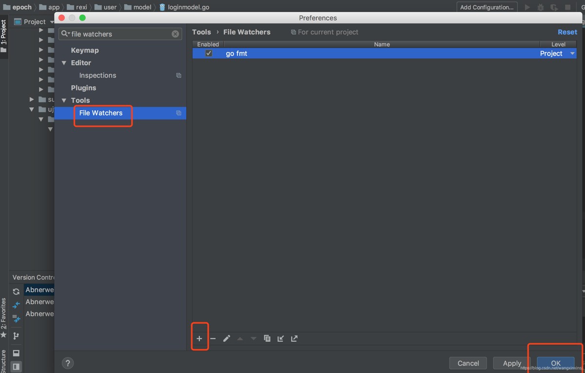 goland->Preferences->搜索框内输入 file watchers->选择File Watchers->点击右边的左下角的 + 号->选择go fmt 模板->弹出设置框,默认选项->点击确定->确定