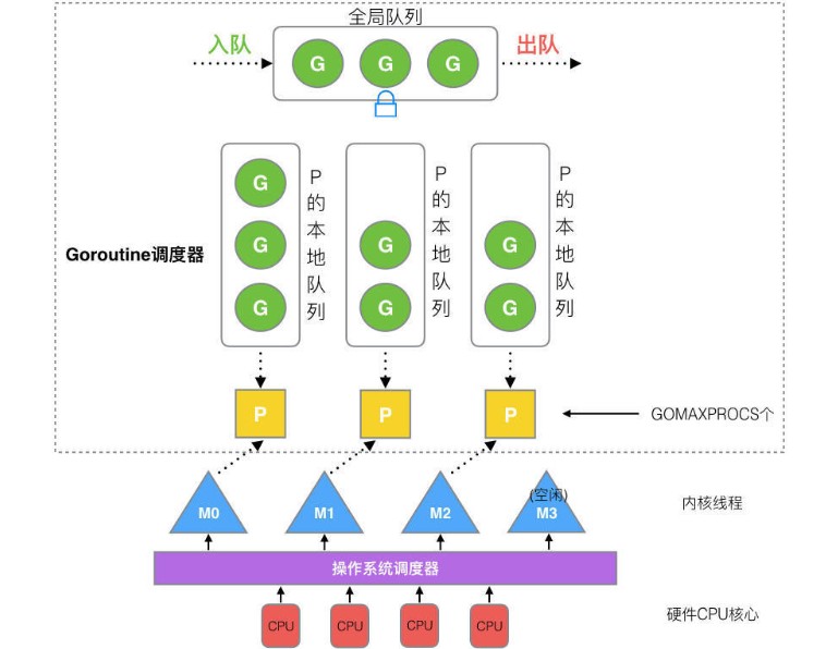 - 全局G队列:当M执行work stealing从其他P中偷不到G时,M可以从全局G队列中获取G