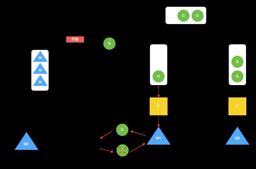- M:线程想运行任务就得获取P,从P的本地队列获取G,P队列为空时,M也会尝试从全局队列拿一批G放到P的本地队列中,或者从其他P的本地队列偷一半放到自己的本地队列中。M运行G,G执行之后,M会从P获取下一个G,不断重复