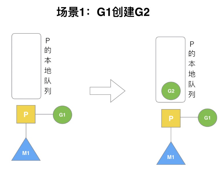 (实现中并不一定是新的 G,如果 G 是 G2 之后就执行的,会被保存在本地队列,利用某个老的 G 替换新 G 加入全局队列)