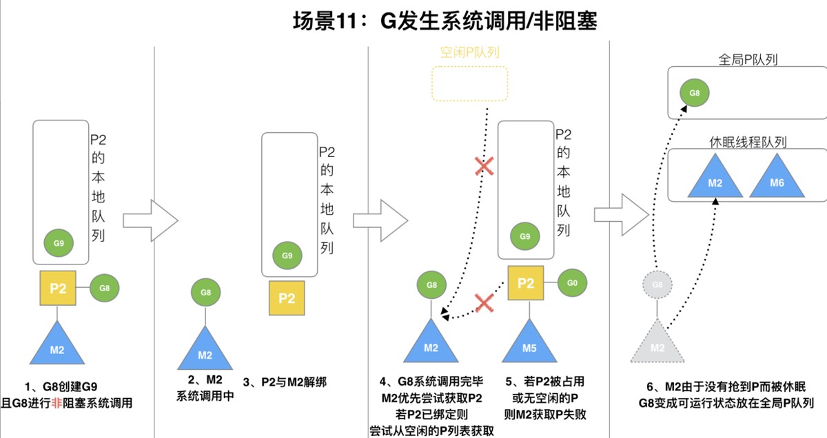 M2 和 P2 会解绑,但 M2 会记住 P2,然后 G8 和 M2 进入系统调用状态。当 G8 和 M2 退出系统调用时,会尝试获取 P2,如果无法获取,则获取空闲的 P,如果依然没有,G8 会被记为可运行状态,并加入到全局队列,M2 因为没有 P 的绑定而变成休眠状态 (长时间休眠等待 GC 回收销毁)。