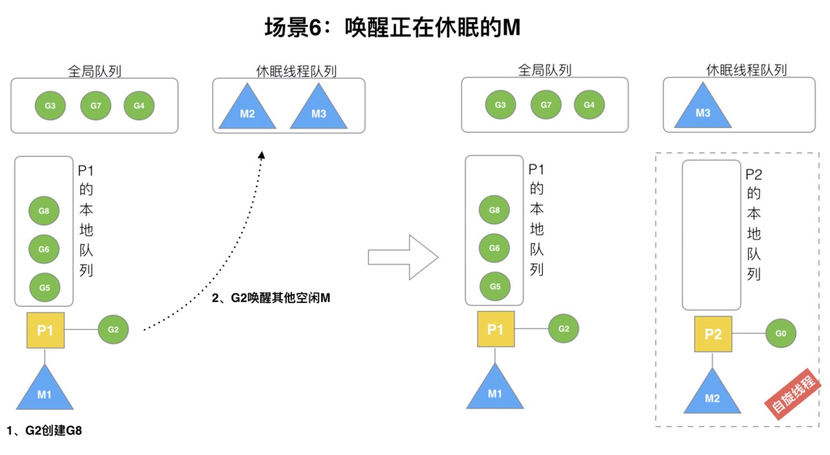 假定当前除了 M3 和 M4 为自旋线程,还有 M5 和 M6 为空闲的线程 (没有得到 P 的绑定,注意我们这里最多就只能够存在 4 个 P,所以 P 的数量应该永远是 M>=P, 大部分都是 M 在抢占需要运行的 P),G8 创建了 G9,G8 进行了阻塞的系统调用,M2 和 P2 立即解绑,P2 会执行以下判断:如果 P2 本地队列有 G、全局队列有 G 或有空闲的 M,P2 都会立马唤醒 1 个 M 和它绑定,否则 P2 则会加入到空闲 P 列表,等待 M 来获取可用的 p。本场景中,P2 本地队列有 G9,可以和其他空闲的线程 M5 绑定