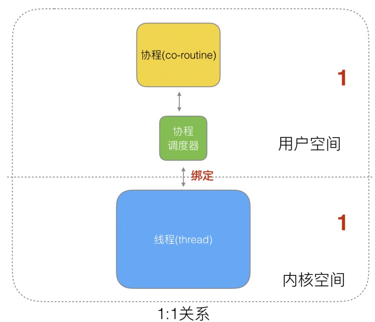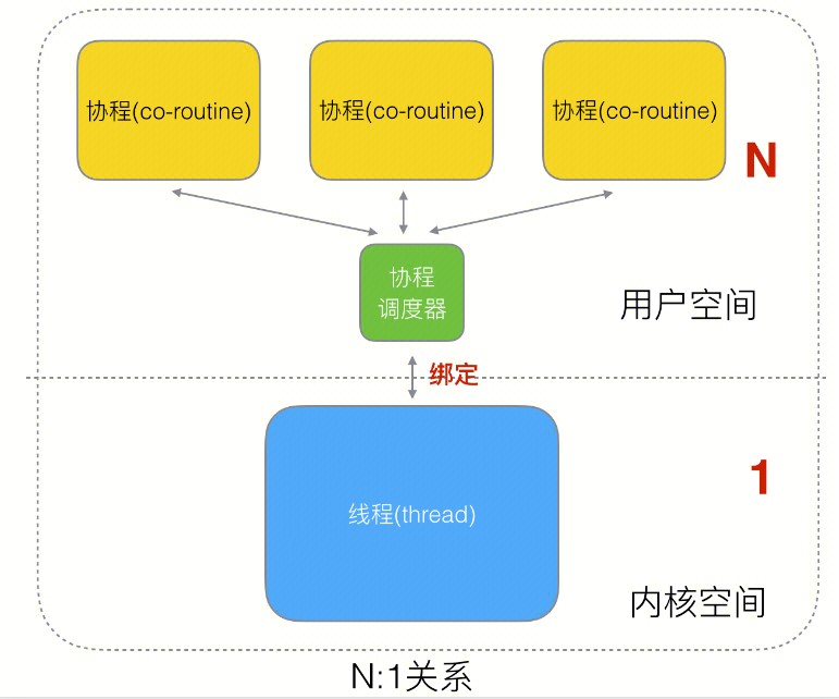 N个协程绑定1个线程,即程序启动后只会创建一个调度线程,用来管理N个协程;