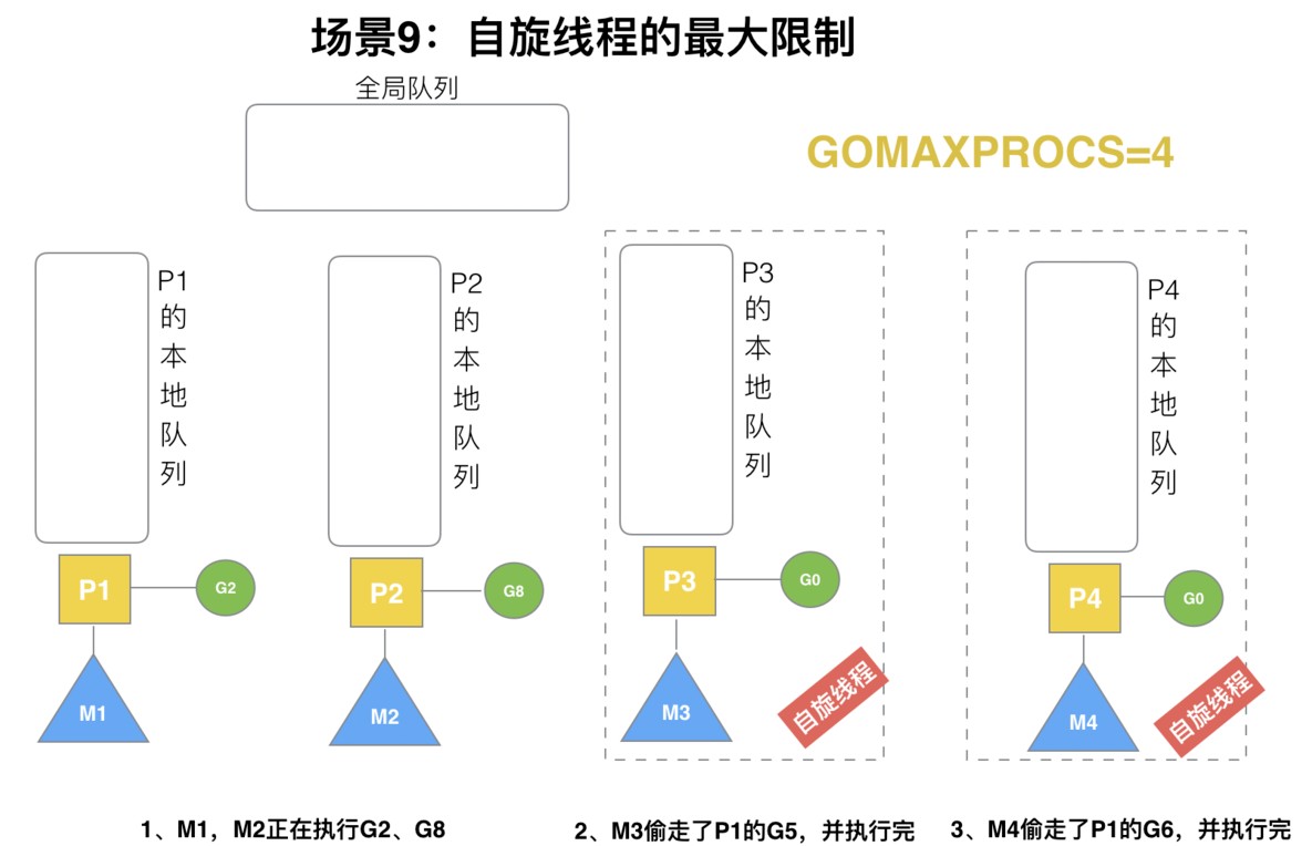 为什么要让 m3 和 m4 自旋,自旋本质是在运行,线程在运行却没有执行 G,就变成了浪费 CPU. 为什么不销毁现场,来节约 CPU 资源。因为创建和销毁 CPU 也会浪费时间,我们希望当有新 goroutine 创建时,立刻能有 M 运行它,如果销毁再新建就增加了时延,降低了效率。当然也考虑了过多的自旋线程是浪费 CPU,所以系统中最多有 GOMAXPROCS 个自旋的线程 (当前例子中的 GOMAXPROCS=4,所以一共 4 个 P),多余的没事做线程会让他们休眠。
