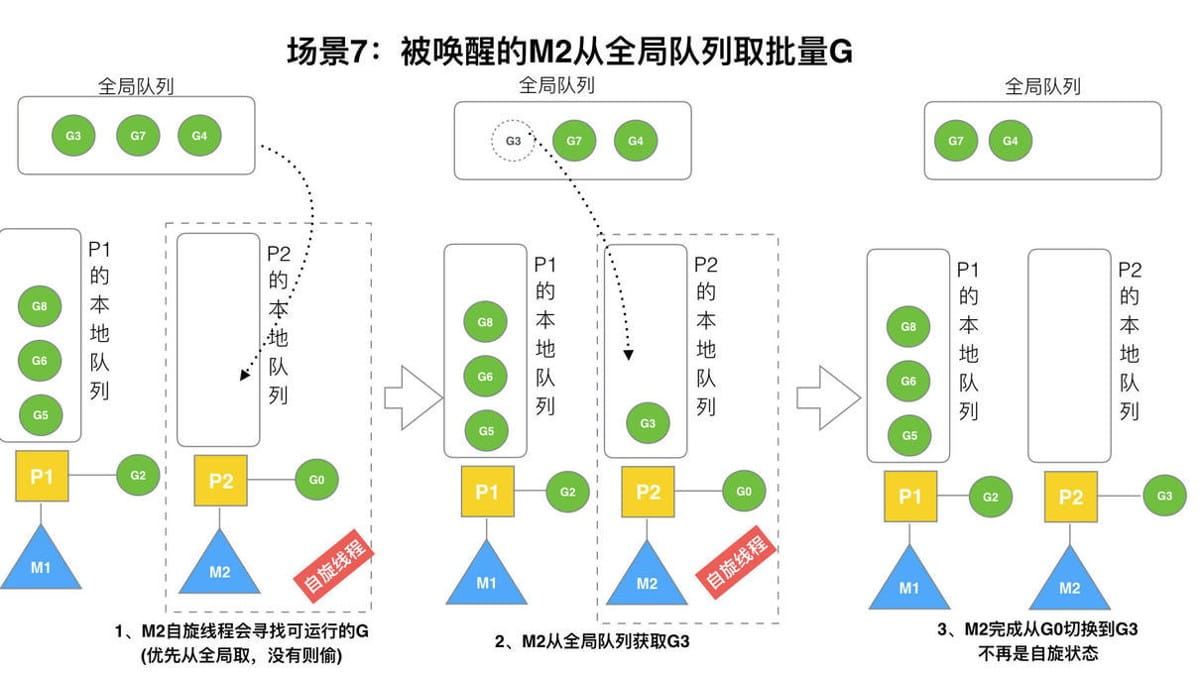 这些G被转移到全局队列时,会被打乱顺序,所以G3,G4,G7被转移到全局队列中的顺序无规则;