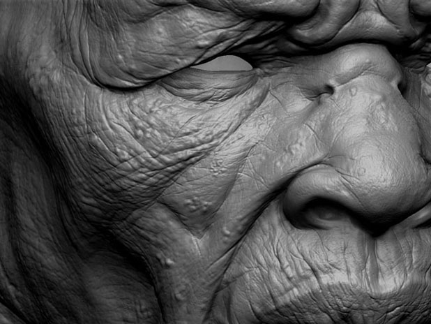 第二种格式雕刻完成之后我开始制作皮肤的皱纹和皱褶。我发现用Standard笔刷做皱纹,直接使用直线产生的效果最好。得到满意的皱纹效果之后,在这些皱纹之间使用Inflat笔刷,最后用Pinch工具做整理。润色可以用阿尔法添加细节,或者增强之前做好的雕刻的细节(图01)。在这个阶段中主要以来收集到的参考资料。脸部周围的方向要合适,要符合真实的情况。