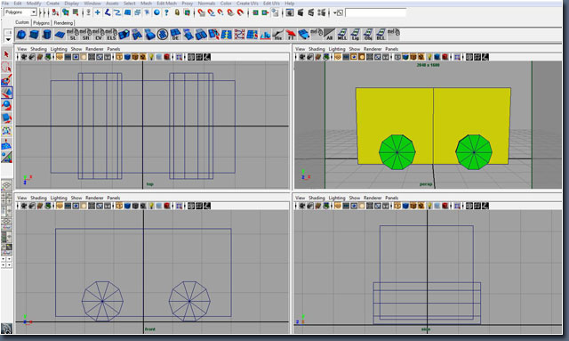 Go to Create Polygon Cylinder and place one cylinder on each side of the chassis. Make sure the cylinders fit the template in size and rotation. Next go to Mesh Combine to combine both cylinders. Delete the history on the chassis and the wheels, making sure that both parts are set to FreezeTransformation. You are now ready to do a Boolean operation.