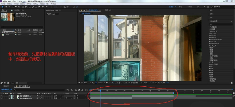 1、制作特效前,先把素材拉到时间线面板中,然后进行裁切。