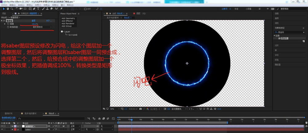 3、将Saber图层预设修改为闪电,给这个图层加一个调整图层,然后将调整图层和saber图层一同预合成,选择第二个,然后,给预合成中的调整图层加一个极坐标效果,把插值调成100%,转换类型是矩形到极线。