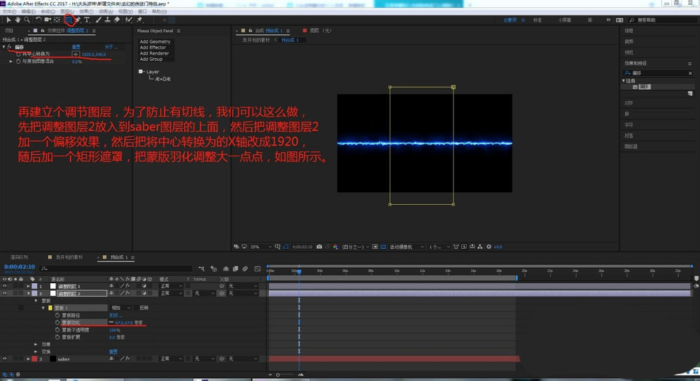 4、再建立个调节图层,为了防止有切线,我们可以这么做,先把调整图层2放入到saber图层的上面,然后把调整图层2加一个偏移效果,然后把将中心转换为的X轴改成1920,随后加一个矩形遮罩,把蒙版羽化调整大一点点,如图所示。