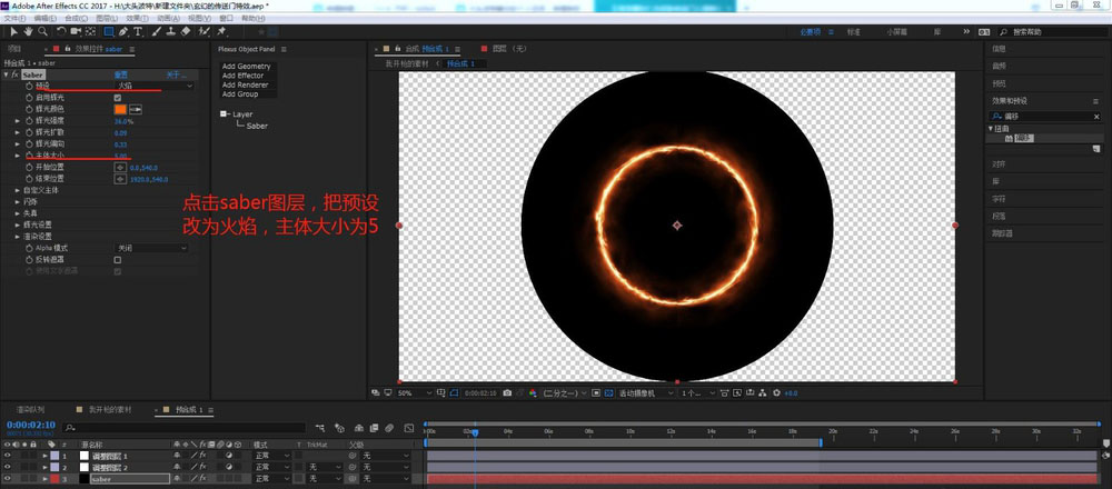 5、点击saber图层,把预设改为火焰,主体大小为5