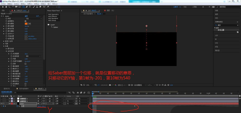 8、给saber图层加一个位移,就是位置移动的意思,只移动它的Y轴,第1帧为-201,第10帧为540