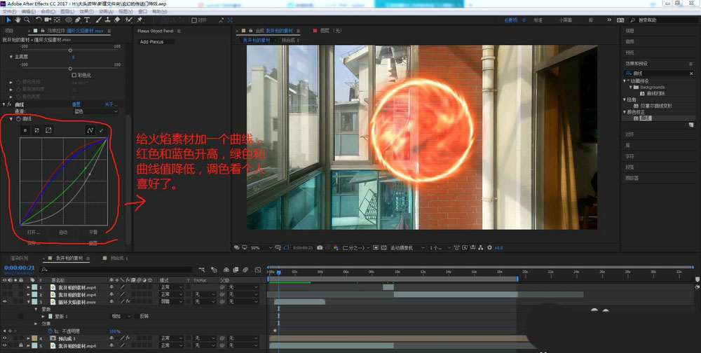 12、给火焰素材加一个曲线,红色和蓝色升高,绿色和曲线值降低,调色看个人喜好了。