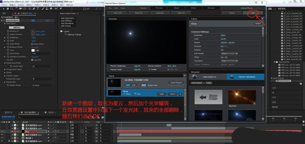 13、新建一个图层,取名为星云,然后加个光学耀斑,在效果器设置中只留下一个发光体,其余的全部删除,随后我们点击OK
