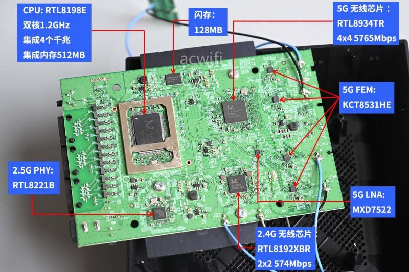 5G无芯片是RTL8934TR,支持802.11be,无线基带方面支持4x4MIMO,在160MHz频宽和4096-QAM下最高无线速率为5765Mbps;射频方面支持4T5R,由于内存容量的限制,无线带机量最高256台。