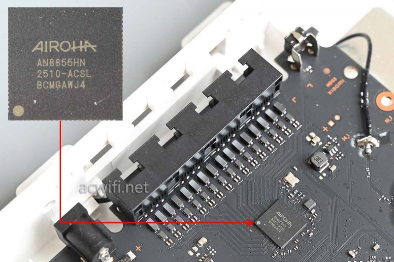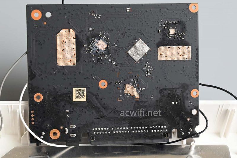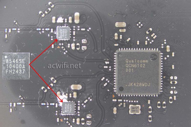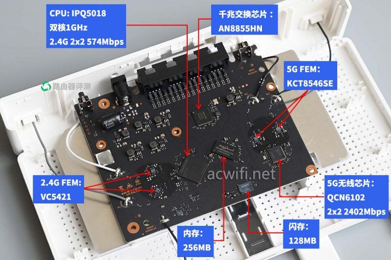 5G无线芯片是QCN6102,支持2x2MIMO的802.11ax,在160MHz频宽和1024-QAM下最高无线速率2402Mbps,无线带机量128台,OFDMA用户数量为8个。