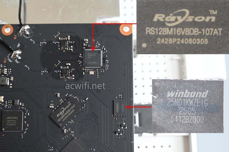 内存型号是RS128M16V8DB-107AT,DDR3-1866,容量256MB;闪存芯片型号W25N01KWZEIG,容量128MB。