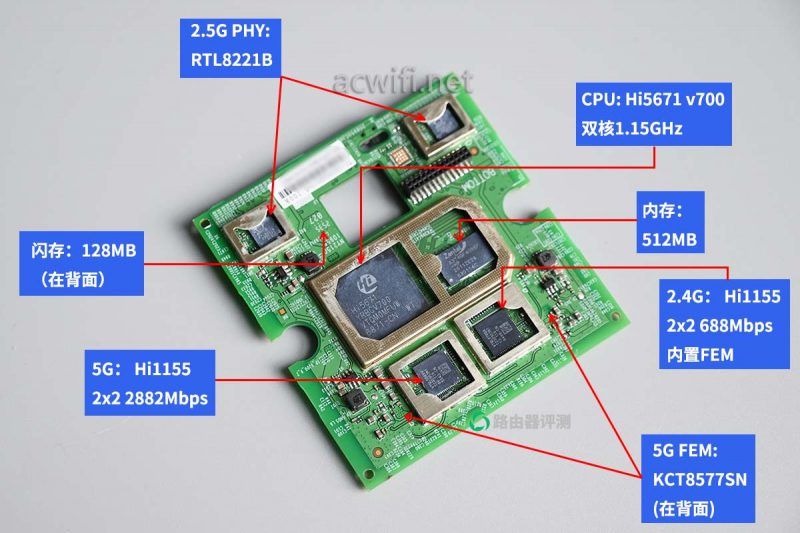 靠近CPU的这颗5G无线芯片上面丝印着”T232953N1“,型号是海思的Hi1155,支持IEEE802.11 a/b/g/n/ac/ax/be,支持2x2MIMO,在160MHz频宽和4096-QAM下最高速率2882Mbps。