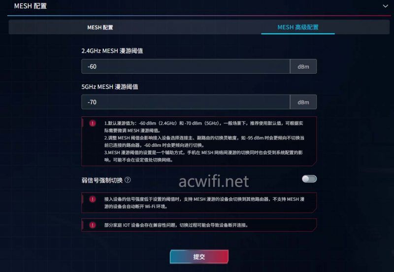 MESH组网后支持“漫游阈值”设置和“弱信号强制切换”功能。