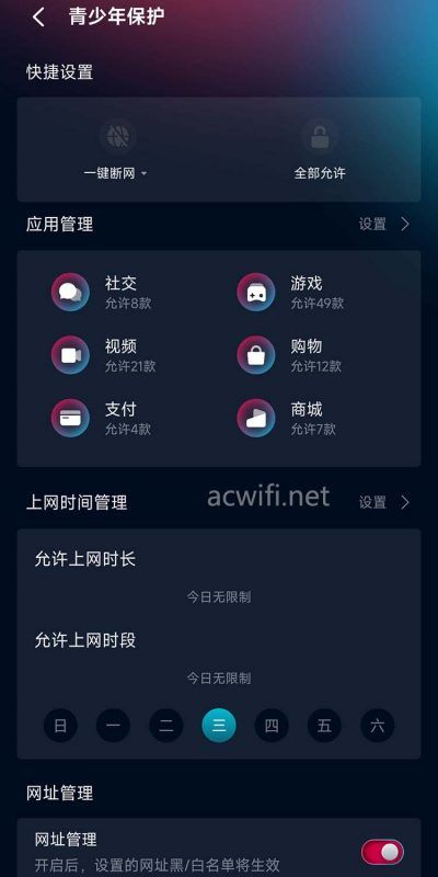 “青少年保护”就是上网行为控制功能,可以控制上网时长禁用一些APP功能等,也是很实用的功能。