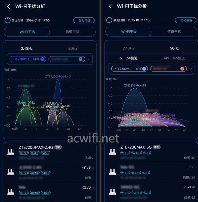 如果看不懂,直接点“优化信道”就可以了。2.4G和5G会自动调为自动信道,自动设定干扰最少的信道。