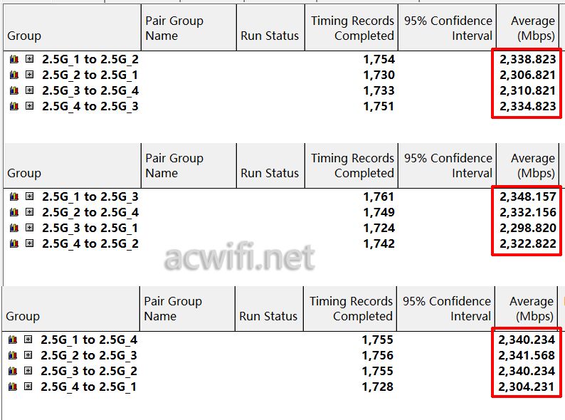 通过四个2.5G网口的三种不同的组合进行双向打流测试,测出每个网口每个主向都能跑满2.5G。(除去数据包的固定开销,上限速度为2.36Gbps左右)