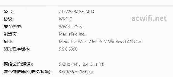 由于有10G SFP+,所以我把5G的频宽设置为160MHz,2.4G频宽40MHz,MT7927无线网卡连接中兴问天BE7200MAX的MLO,无线速率显示3570Mbps,即2882Mbps(5G)+ 688Mbps(2.4G)。