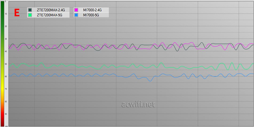 在隔了一堵水泥墙的E点位置,两者的2.4G信号强度差不多,5G信号是中兴问天BE7200MAX明显强。