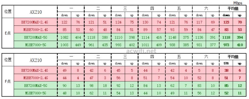 在E点位置里,2.4G的上、下行速度都是中兴问天BE7200MAX快,在F点位置里,下行速度是小米BE7000快。