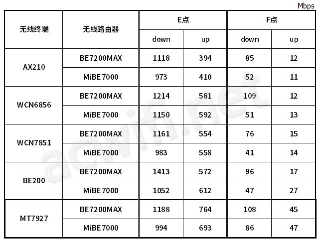 前面测的无线信号强度,接着这里测试无线传输速度,只测E和F两个位置点,不过这里用了五款不同的无线网卡来测速。所有小主机的天线一样且高度保持一致。五款无线网卡分别是AX21WCM9856、BE200、WCN7851和MT7927: